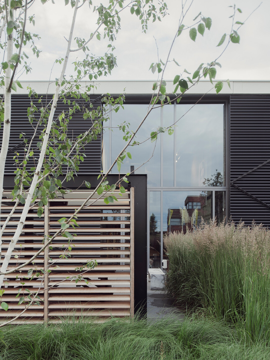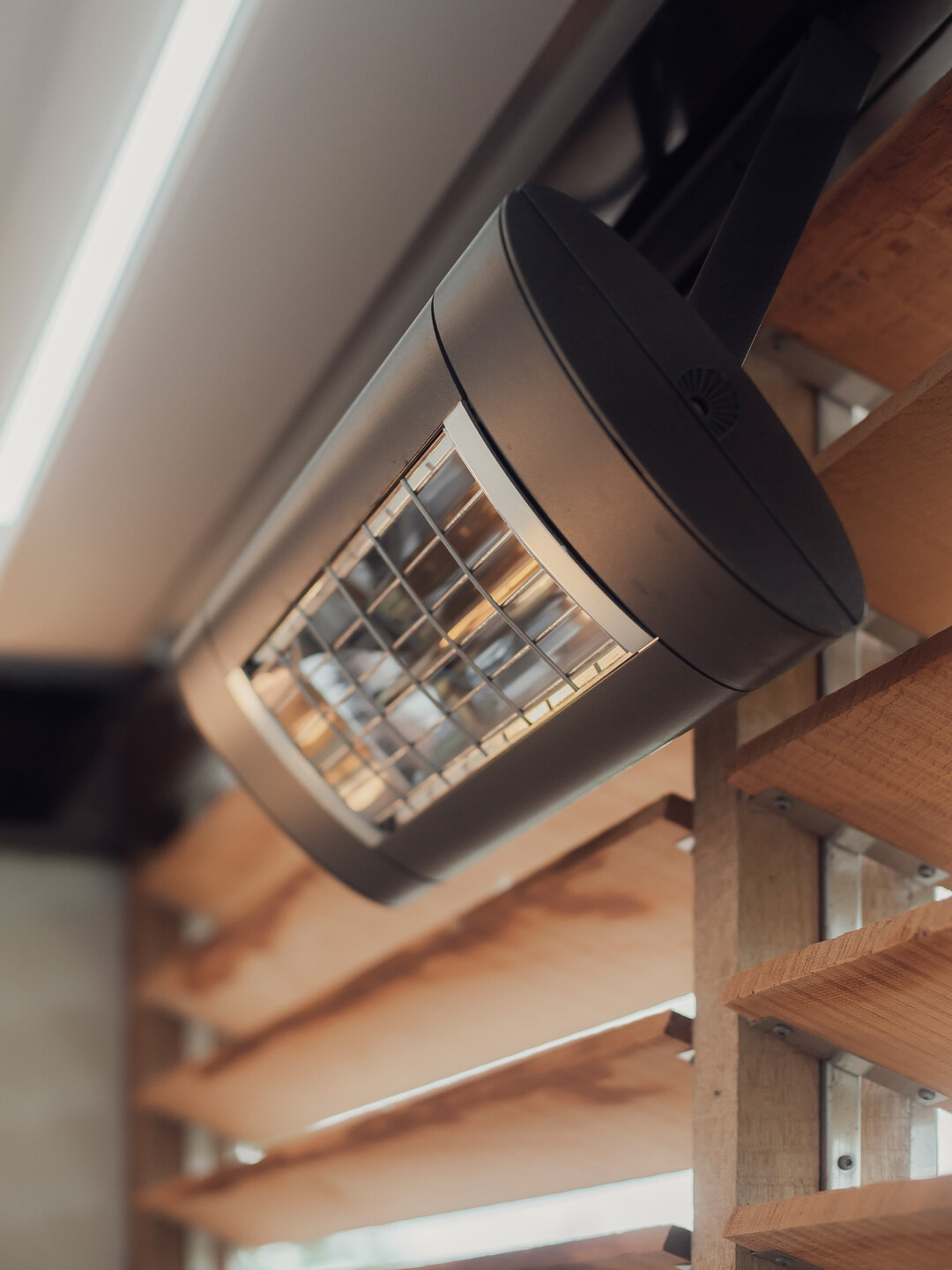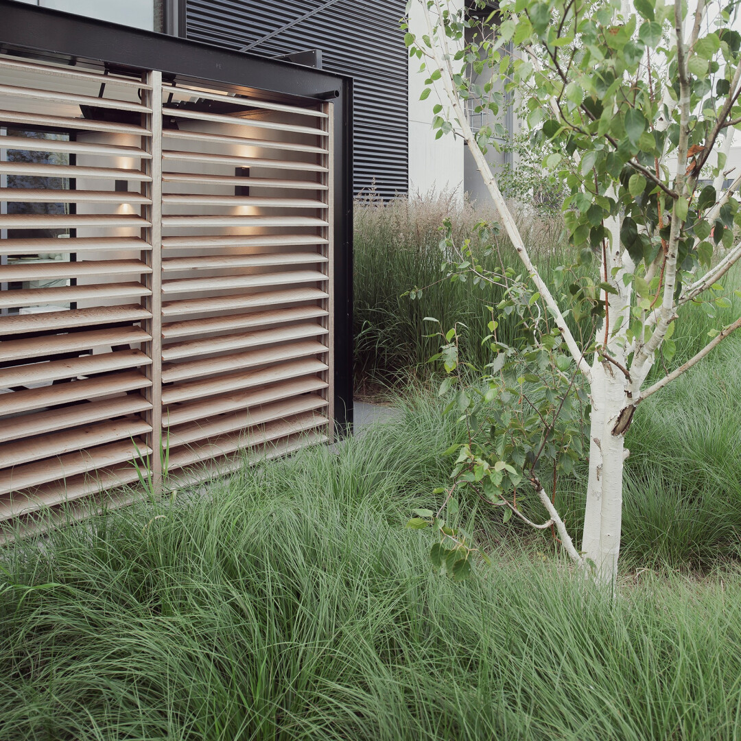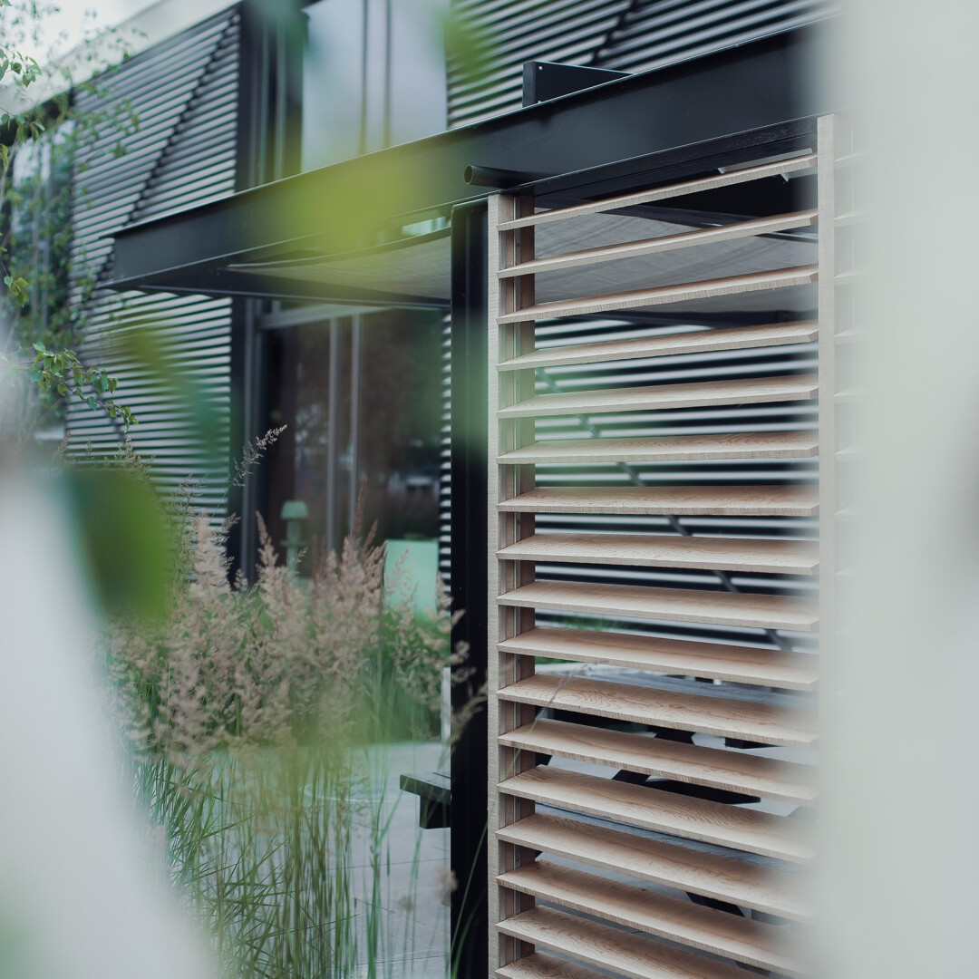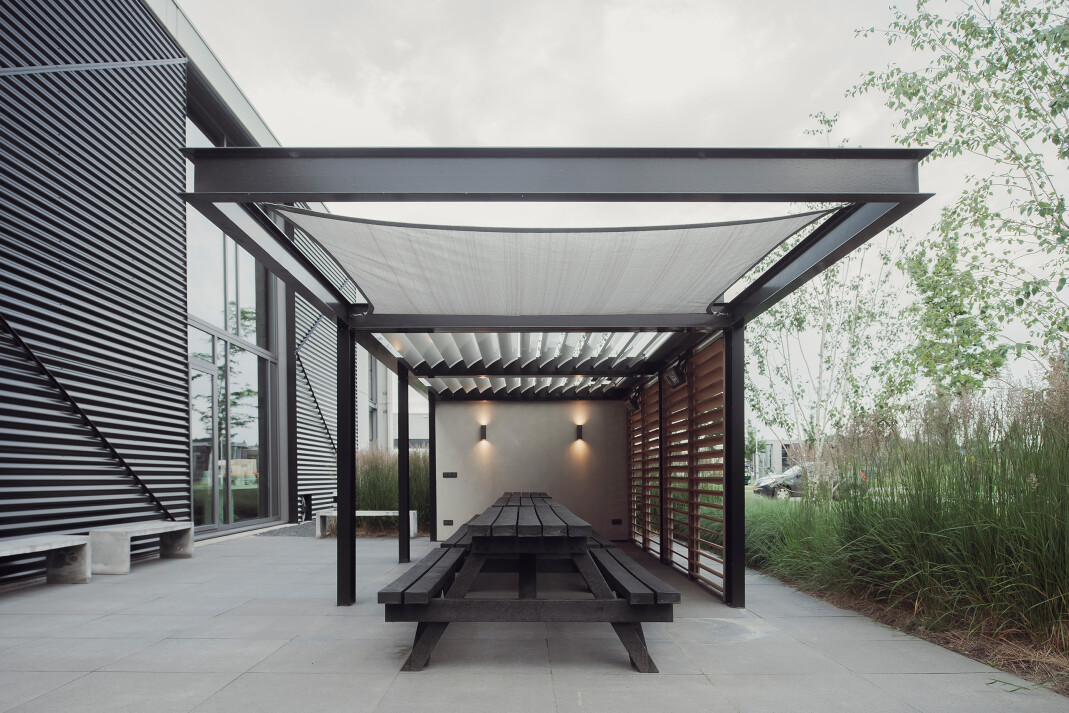 Deze moderne overkapping bij HK Living is het perfecte voorbeeld van een strak en functioneel ontwerp. De open structuur met moderne materialen zoals staal en glas creëert een lichte en luchtige sfeer, terwijl de houten lamellen zorgen voor een subtiele afscheiding en privacy. De overkapping biedt de ideale plek voor zowel zakelijke als privébijeenkomsten en vormt een aanvulling op de eigentijdse uitstraling van het gebouw en de omgeving.
