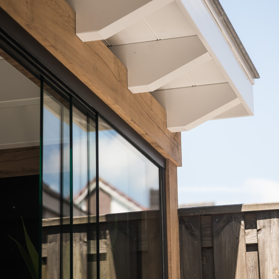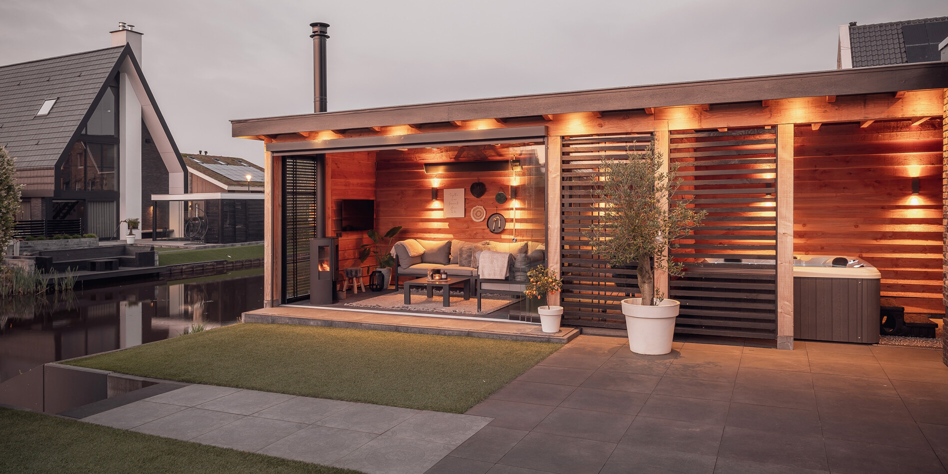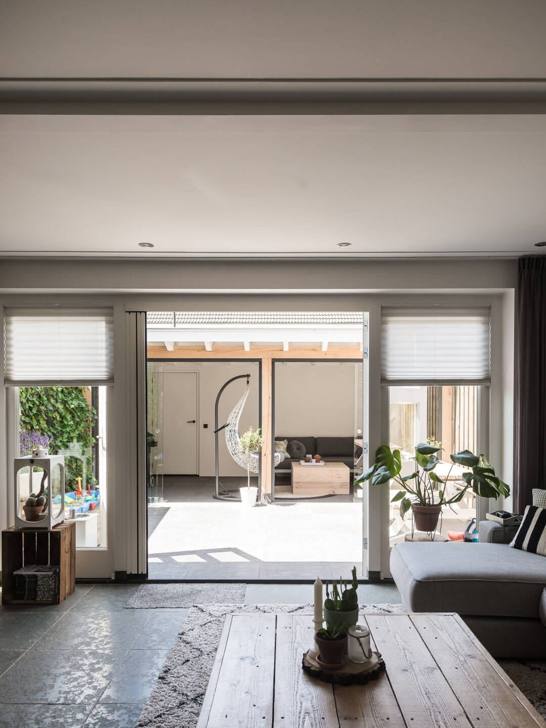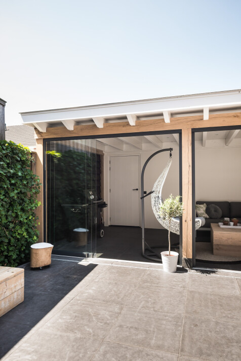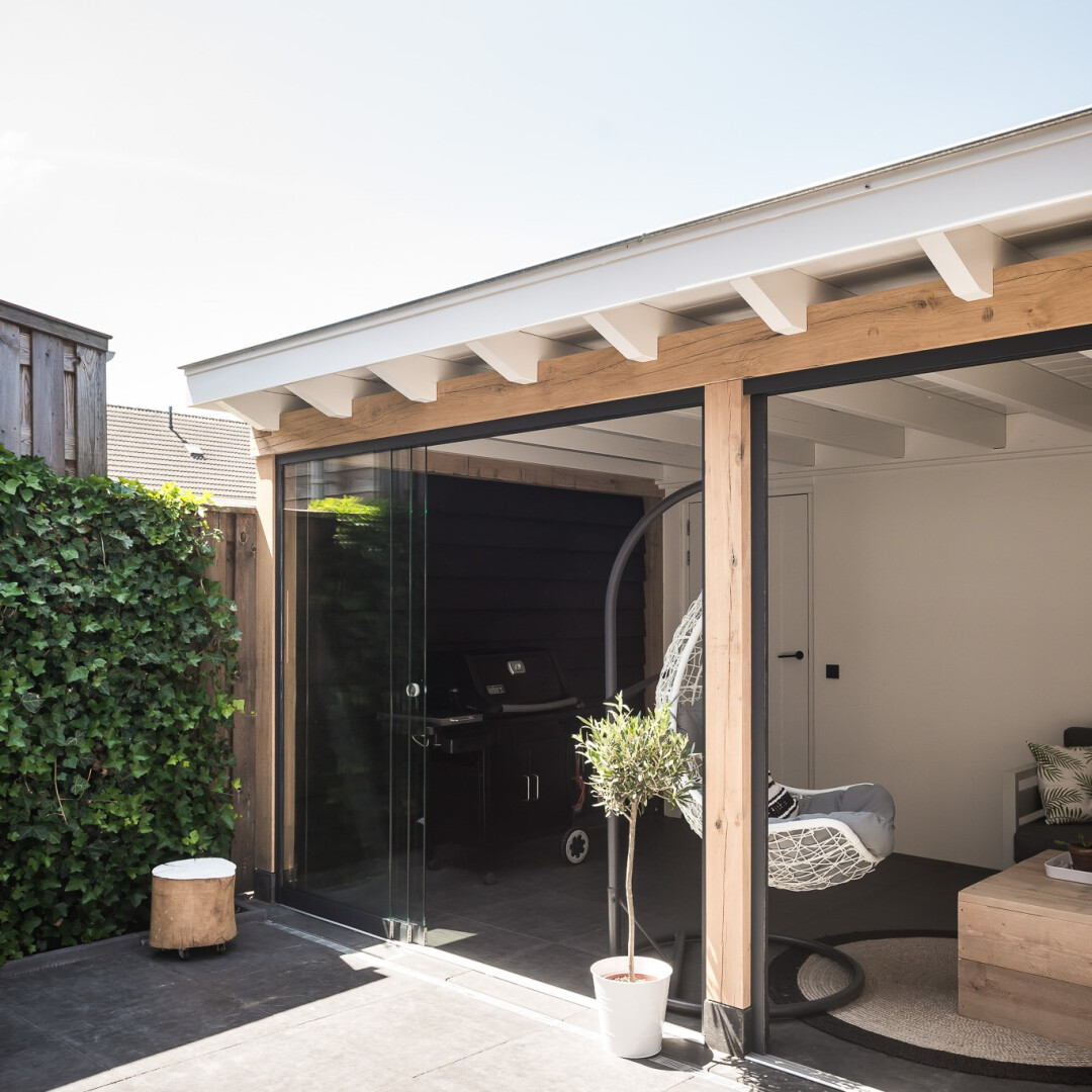 Deze tuinkamer in Bunschoten is ontworpen met een innovatieve schuifwand, die de ruimte verbindt met de tuin. Dankzij het gebruik van glazen wanden kunt u de kamer eenvoudig openen en genieten van de frisse lucht en het uitzicht op de tuin. De schuifwand maakt de ruimte veelzijdig, perfect voor zowel zonnige dagen als koelere avonden, wanneer de ruimte volledig kan worden afgesloten.