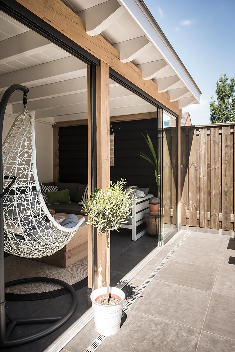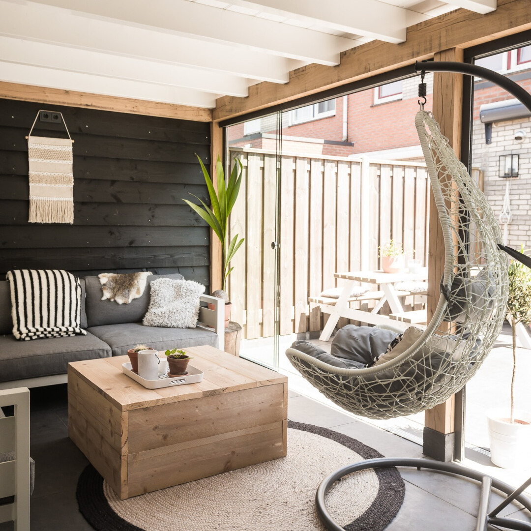 Het interieur van deze tuinkamer combineert een modern zitgedeelte met het gebruik van natuurlijke materialen, zoals het houten plafond en de strakke houten accenten. De zithoek is ideaal voor ontspanning, met comfortabele meubels en een fijne hangstoel om in weg te dromen.
