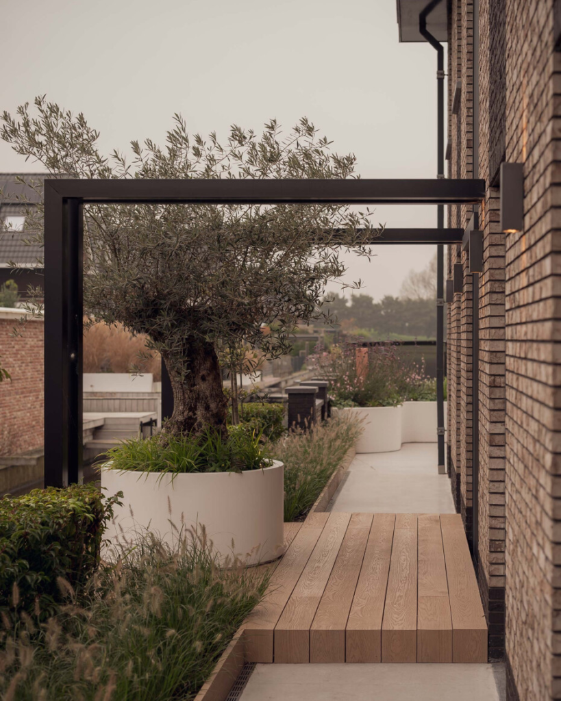 Strakke lijnen in combinatie met organische vormen zorgen voor een moderne maar warme uitstraling. Denk aan houten overkappingen, pergola’s en buitenkamers die de ruimte kaderen zonder haar op te sluiten. De balans tussen open en gesloten, licht en schaduw, wordt steeds verfijnder.
