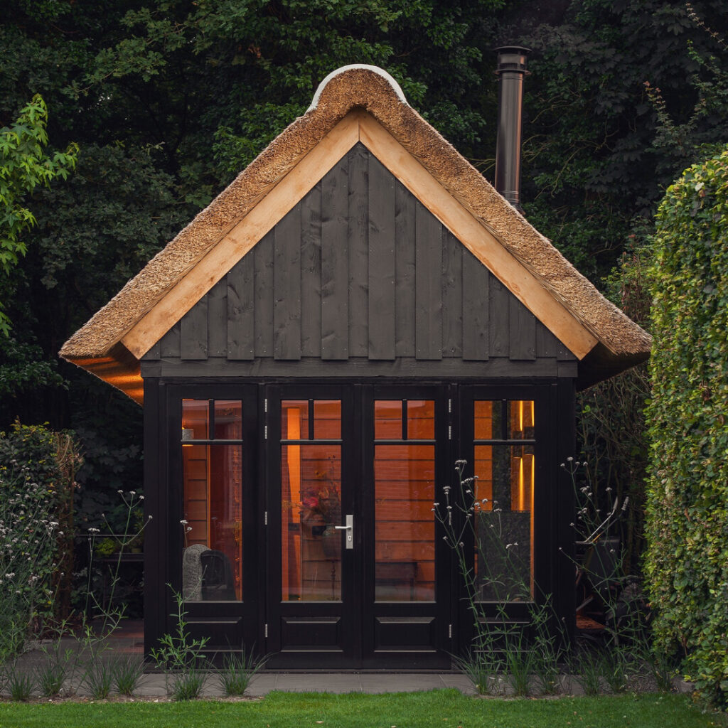 Een rieten dak geeft het tuinhuis extra diepte door de structuur van het materiaal. Het riet tekent mee met het licht en zorgt hierdoor voor een warme gloed. De vorm van het dak benadrukt de lijnen van het ontwerp en geeft de tuin meer uitstraling. Deze combinatie laat het tuinhuis levendig aanvoelen. Zo ervaar je dagelijks de kracht van natuurlijke materialen.