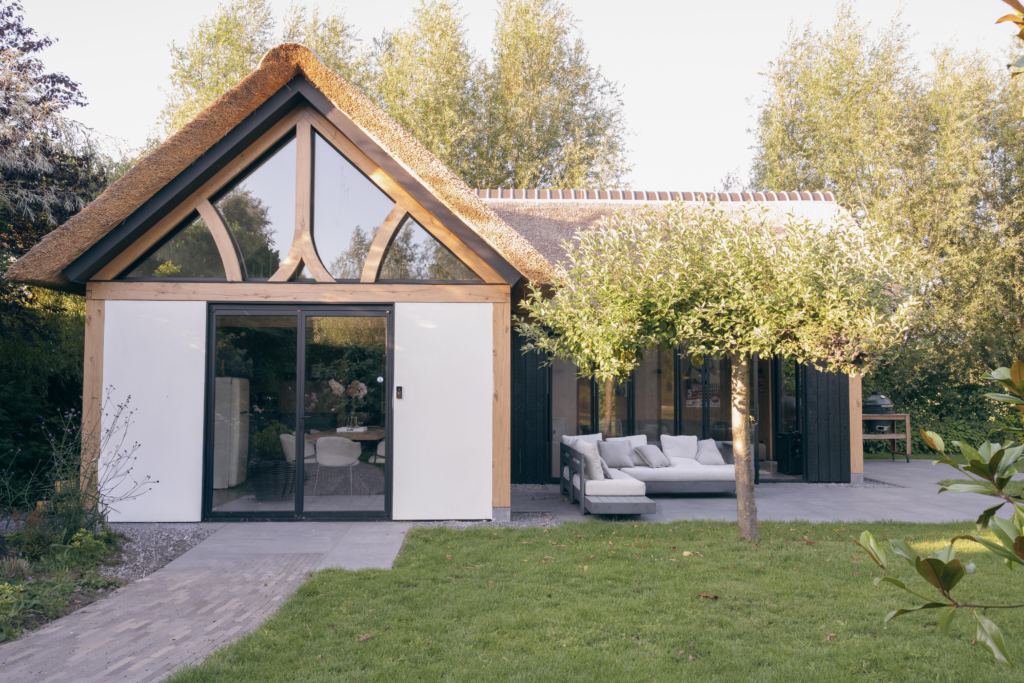 Een tuinhuis met rieten dak biedt ruimte voor persoonlijke invulling. Grote raampartijen versterken het contact met de tuin. Een overstek geeft schaduw en beschutting tijdens warme dagen. Een zithoek maakt het tuinhuis geschikt voor lange avonden buiten. Het ontwerp volgt jouw manier van leven en sluit hierdoor volledig aan op de tuin. Zo ontstaat maatwerk dat past bij ieder seizoen.