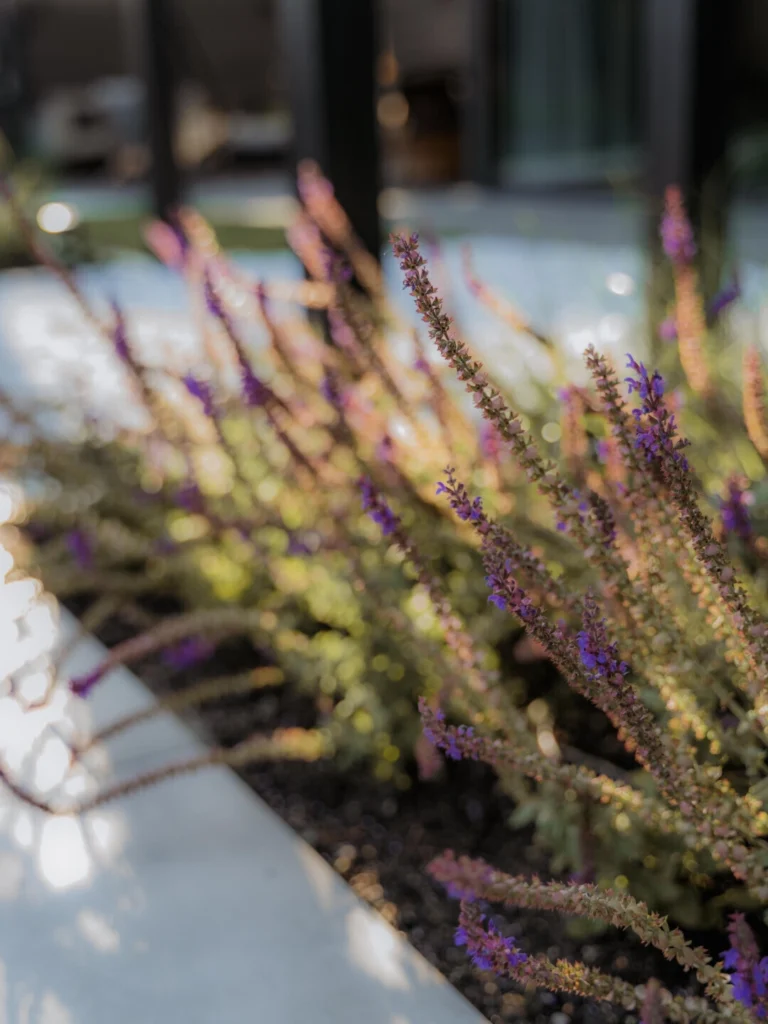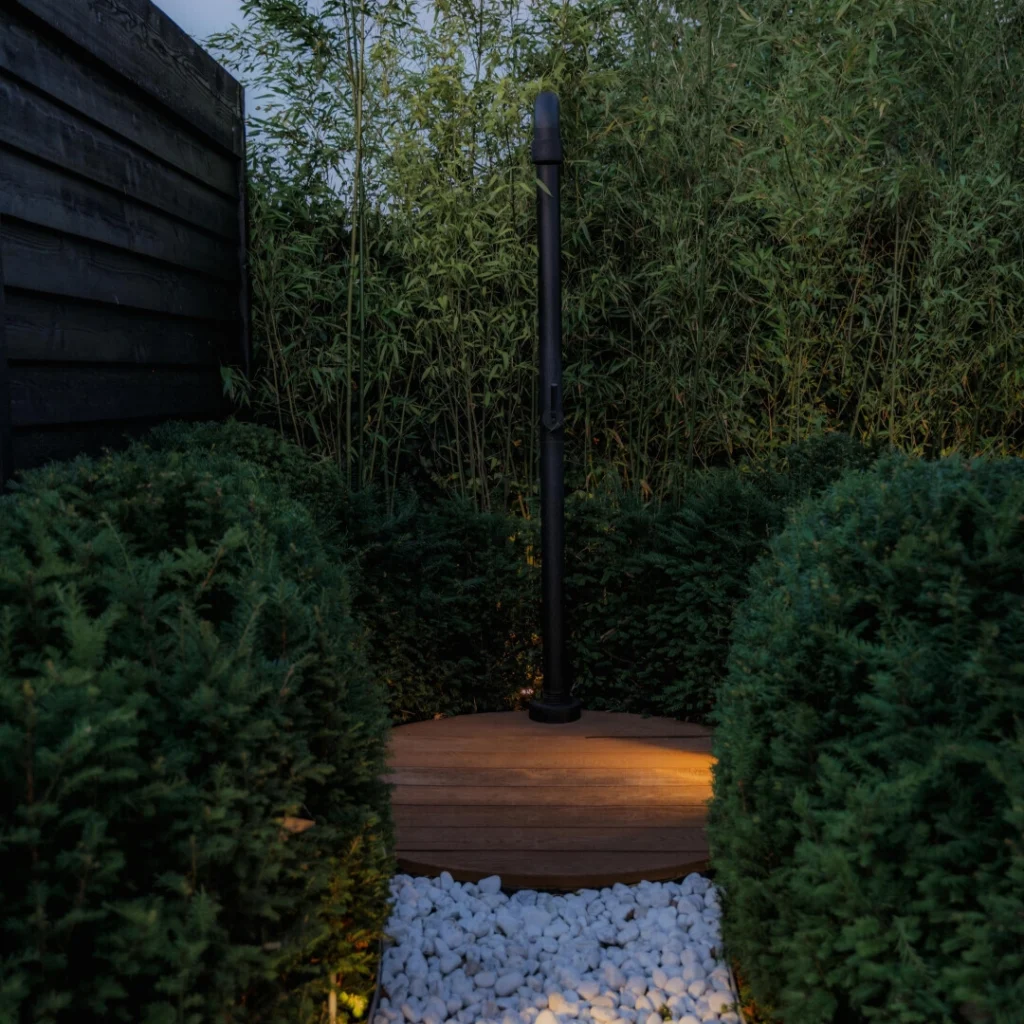 Eén van de blikvangers in deze tuin is de buiten eetkamer met haard, een plek die uitnodigt tot lange avonden tafelen, ongeacht het seizoen. De overkapping biedt beschutting tegen de zon en wind, terwijl de open haard zorgt voor warmte en gezelligheid. Deze buitenruimte is volledig geïntegreerd in het tuinontwerp en vormt een natuurlijke verlenging van de woning.