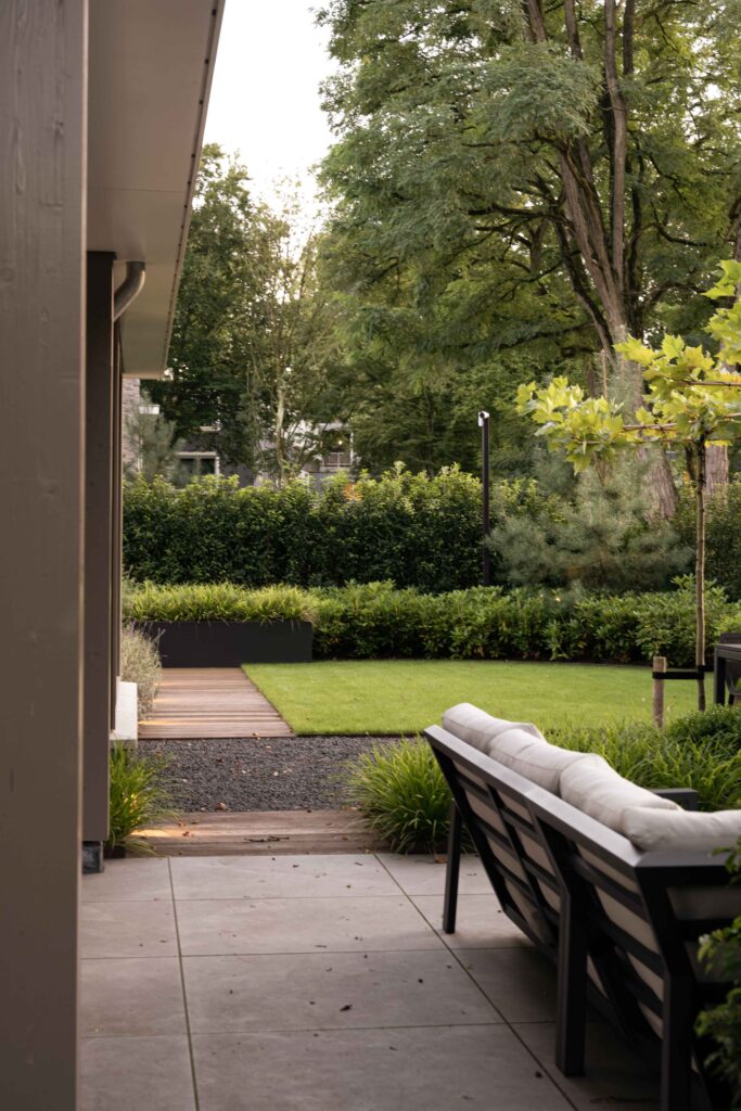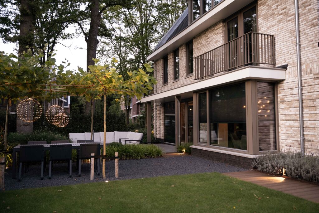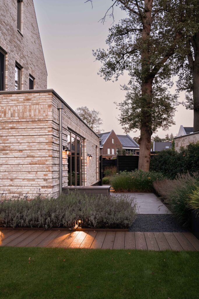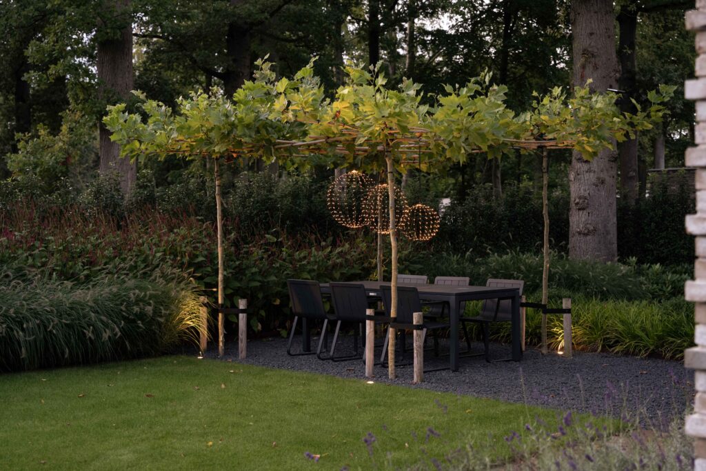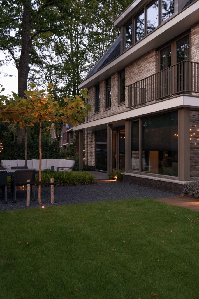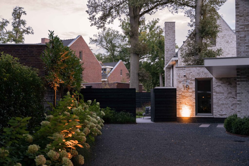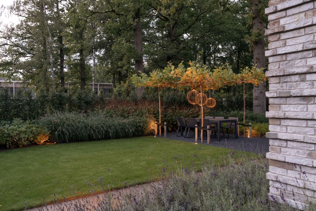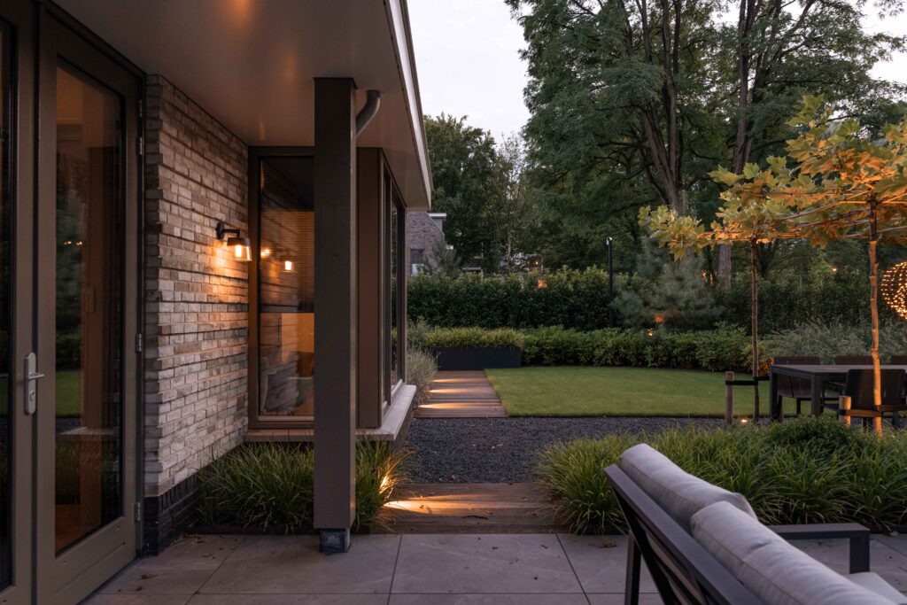 Een volledig aangelegde tuin rondom het huis, een apart tuingedeelte voor de huisdieren, praktisch met toch de charme van een bosrijke omgeving. In dit ontwerp zie je alles terug. De juiste plant op de juiste plek, een goed lichtplan en de juiste materialen zorgen samen voor een sfeervolle plek om te ontspannen en te relaxen. Een plek waar je graag bent; je eigen tuin!