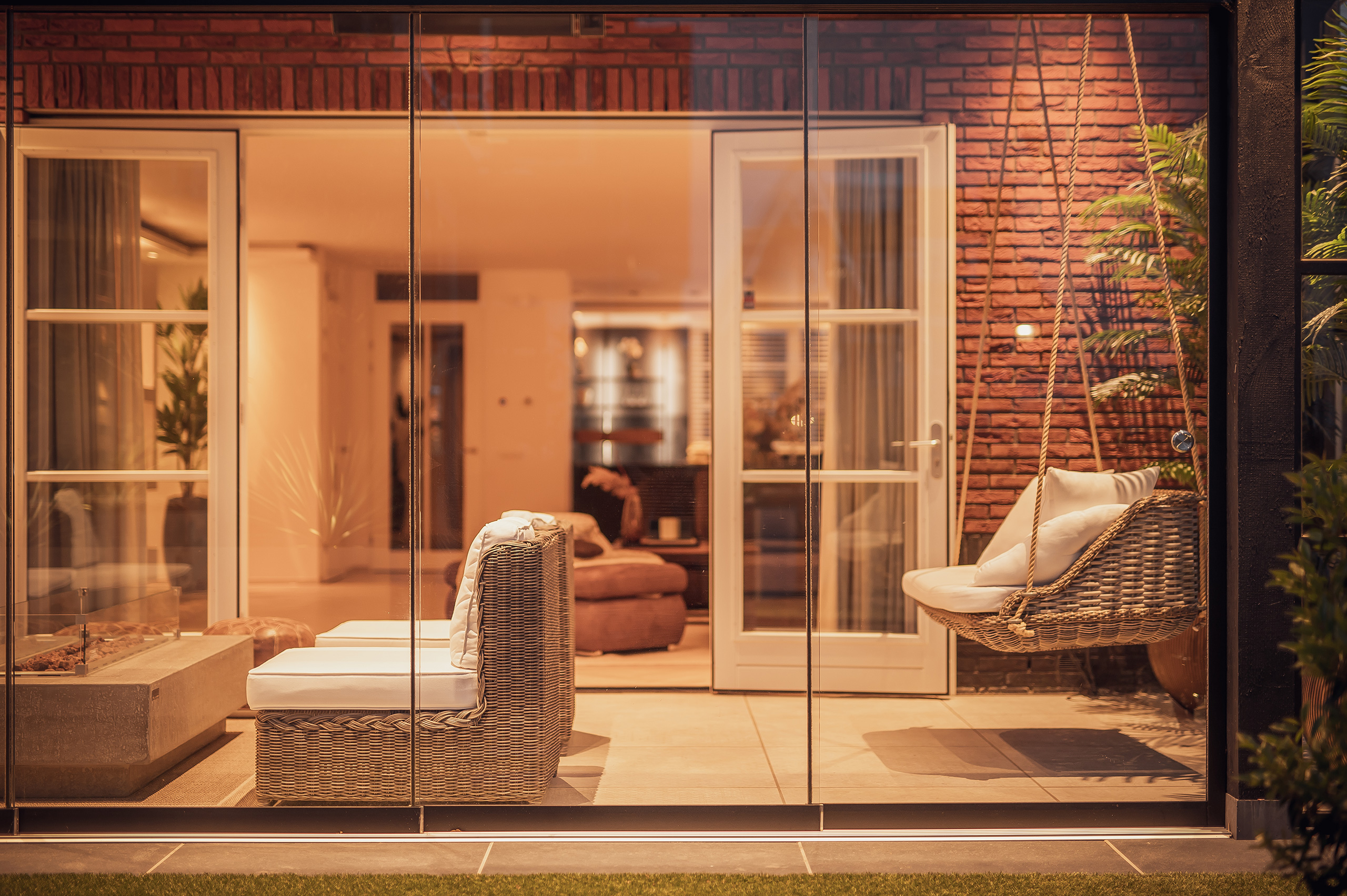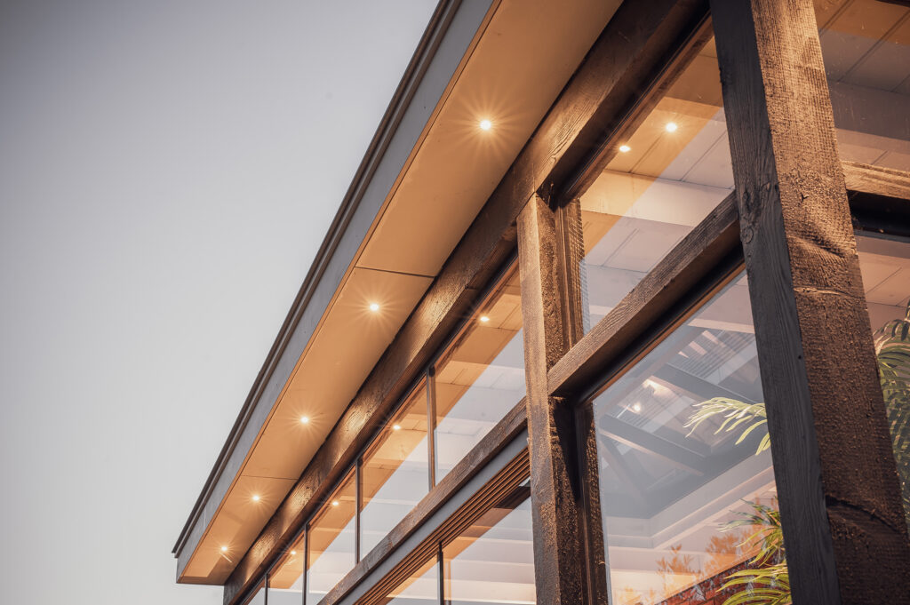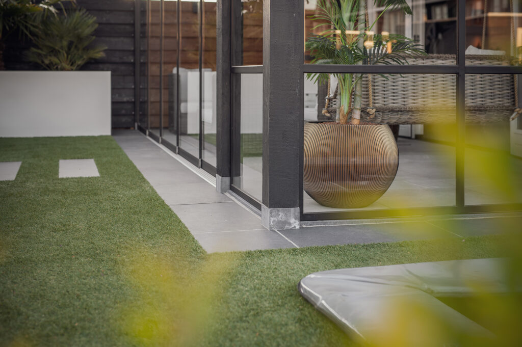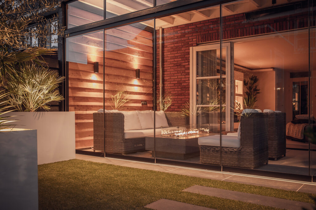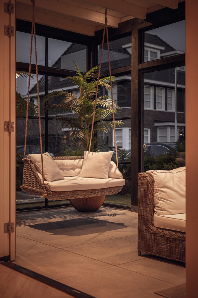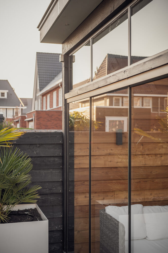 Deze veranda is een schitterend voorbeeld van hoe openheid en comfort elkaar ontmoeten. De grote glazen wanden bieden een prachtig uitzicht op de tuin, terwijl de lichtkoepel zorgt voor een overvloed aan natuurlijk licht, waardoor de ruimte het hele jaar door fris en uitnodigend blijft. De combinatie van warme houten accenten en strakke lijnen creëert een moderne maar toch gezellige sfeer.