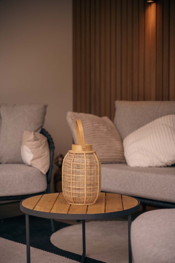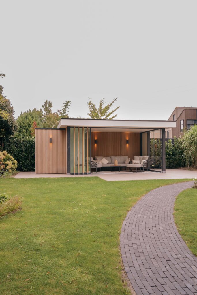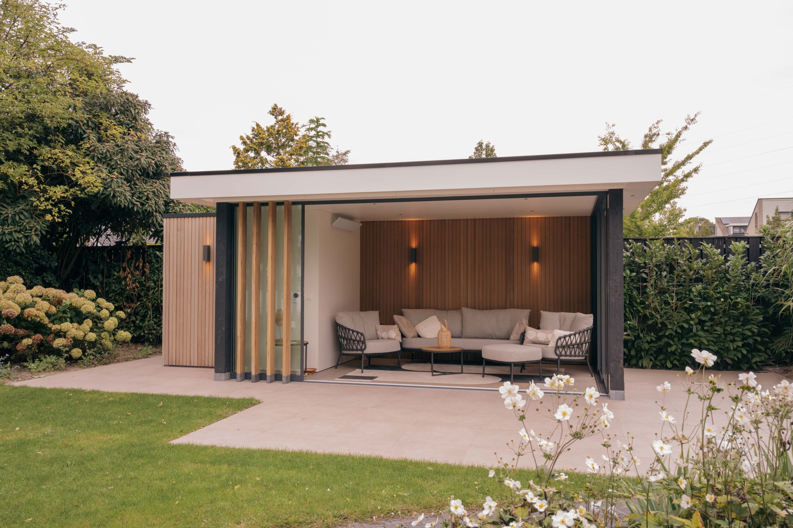 Voor dit buitenverblijf kozen we voor materialen die mooi oud worden en weinig onderhoud vragen. De houten wandbekleding zorgt voor een natuurlijke uitstraling en de glazen zijwand en lamellen spelen met licht en privacy.
